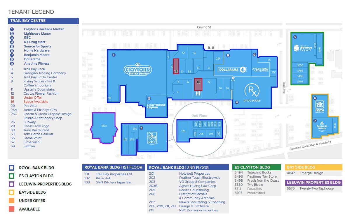 The project is strategically located on the southeast corner of Trail Avenue and Cowrie Street, the heart of Sechelt’s Town Centre. Trail Bay Centre encompasses over 60 stores, shops, and restaurants and it is anchored by Clayton’s Heritage Market, a Liquor Store, Rx Drug Mart, Royal Bank, Home Hardware, Westland Insurance, and many others.